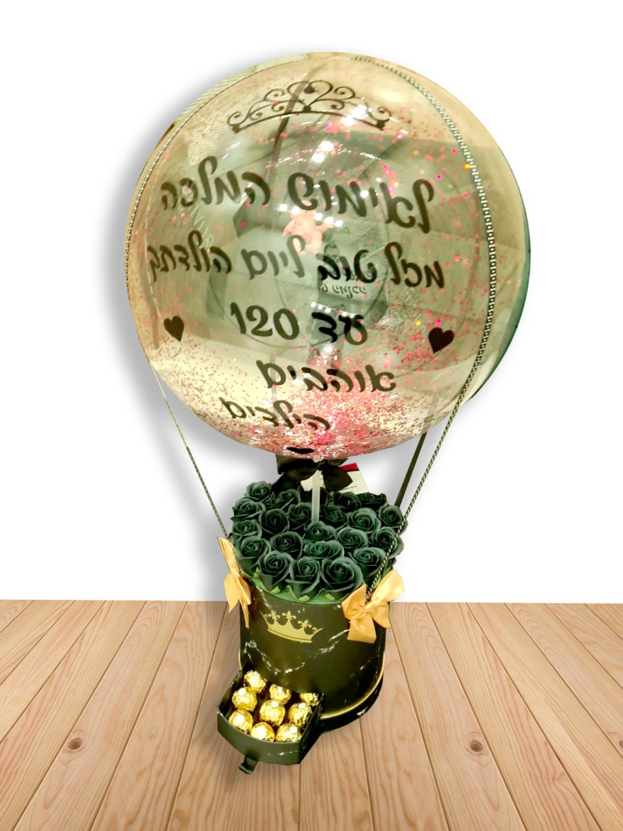 מארז כדור פורח יוקרתי בקופסת לב/עיגול מהודרת, משולב פרחי סבון ריחניים במבחר צבעים, הכולל בלון הקדשה אישית כדור פורח.